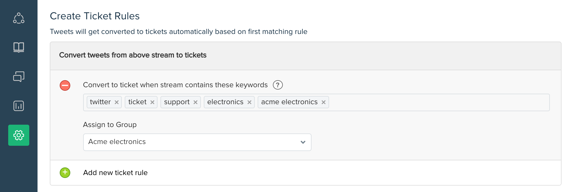 You can create rules to convert @mentions of this account containing certain keywords to tickets automatically. You can add multiple rules, and the tweets will be converted to tickets based on the first matching rule.