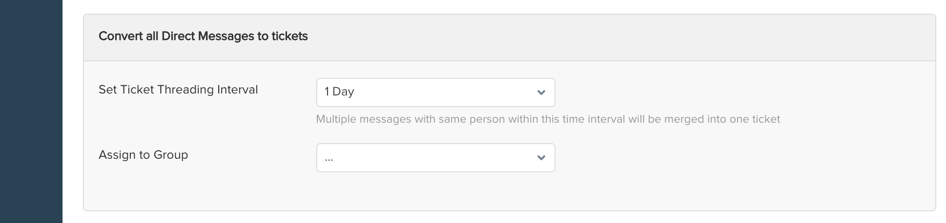 - Threading interval is the time limit up to when a DM conversation between your account and another account will be considered as a single ticket. Use the drop down to pick a time limit.